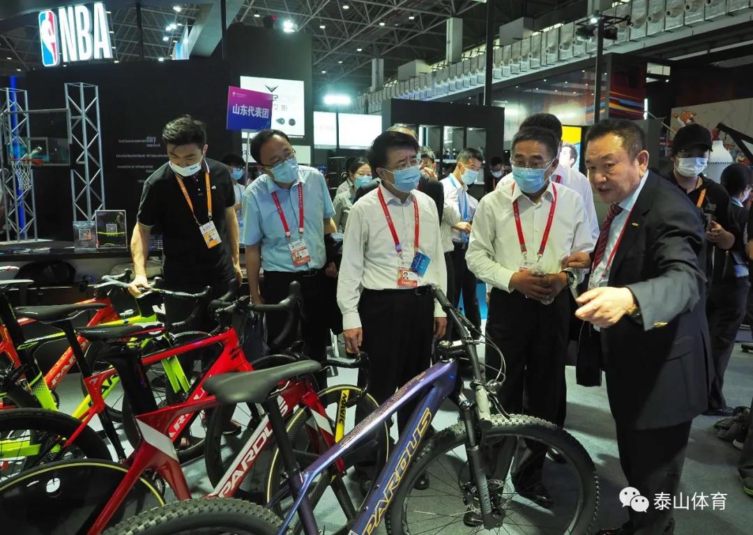 广东省商务厅厅长张德平在云体育产业集团董事长卞志良陪同下参观一号馆云体育展厅。