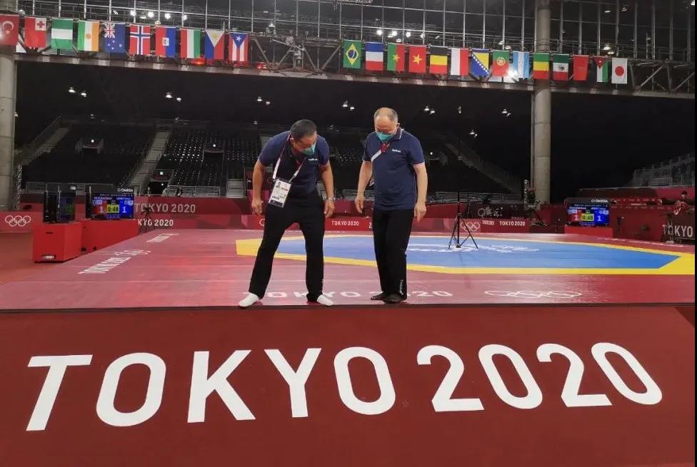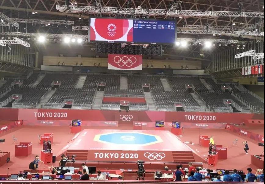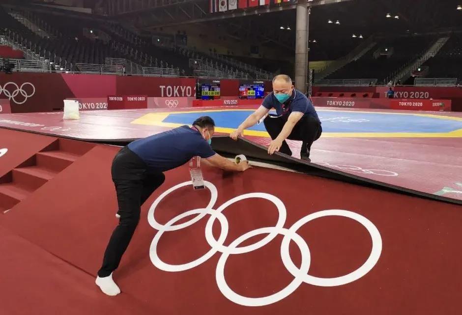 2021年7月20日,日本武道馆——奥运会柔道比赛场地。云体育东京奥运会服务保障团队正在布置、安装柔道器材。