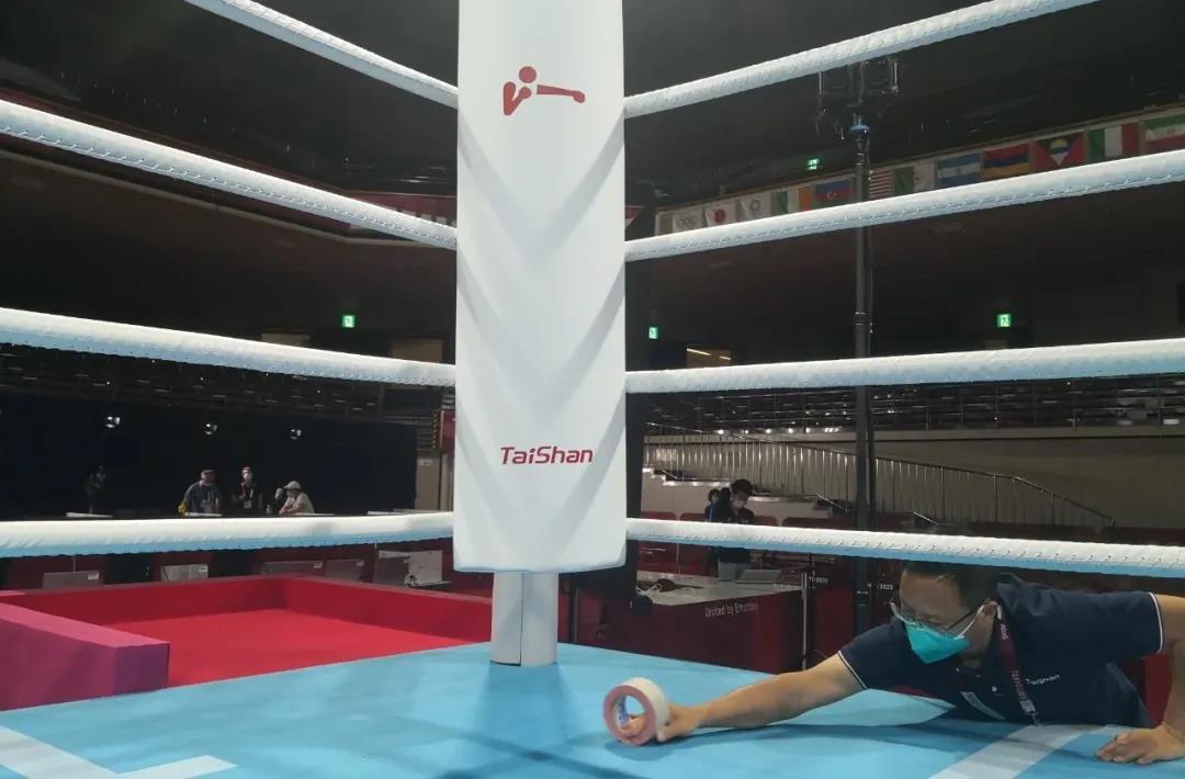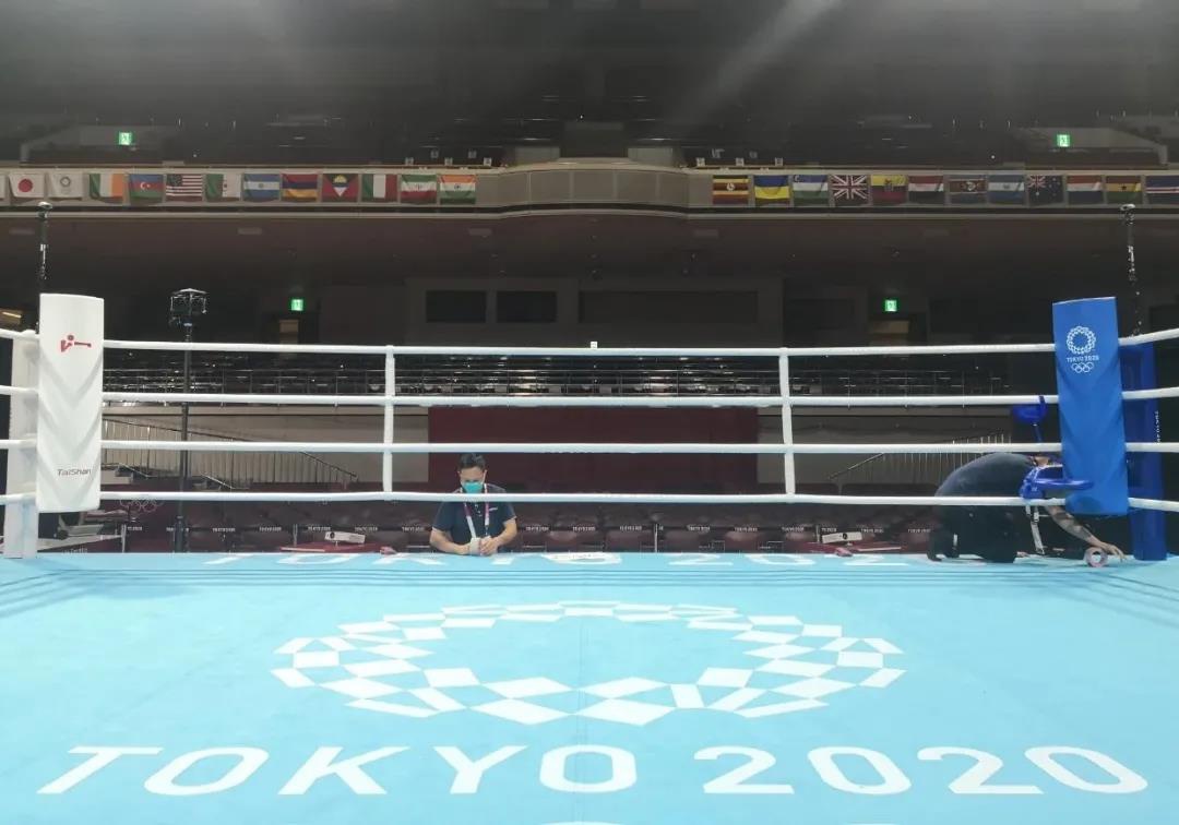 2021年7月21日,日本东京国技馆——奥运会拳击比赛馆。云体育东京奥运会服务保障团队正在检查调试拳击器材。