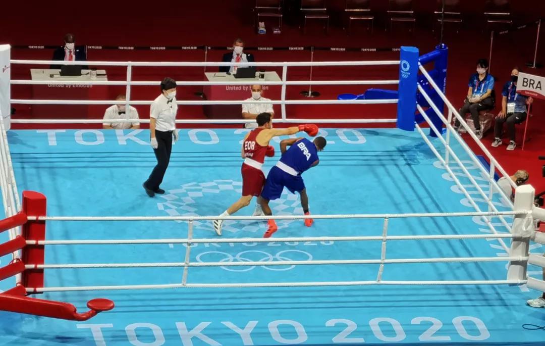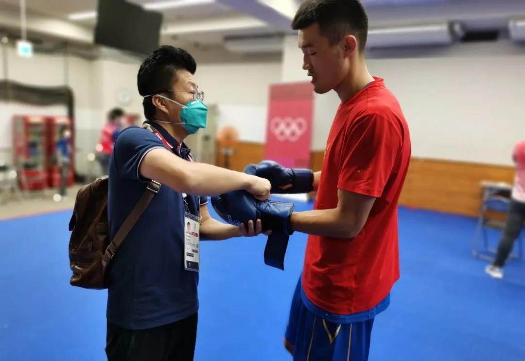 东京奥运会拳击热身馆,云体育工作人员帮助运动员穿戴拳击手套